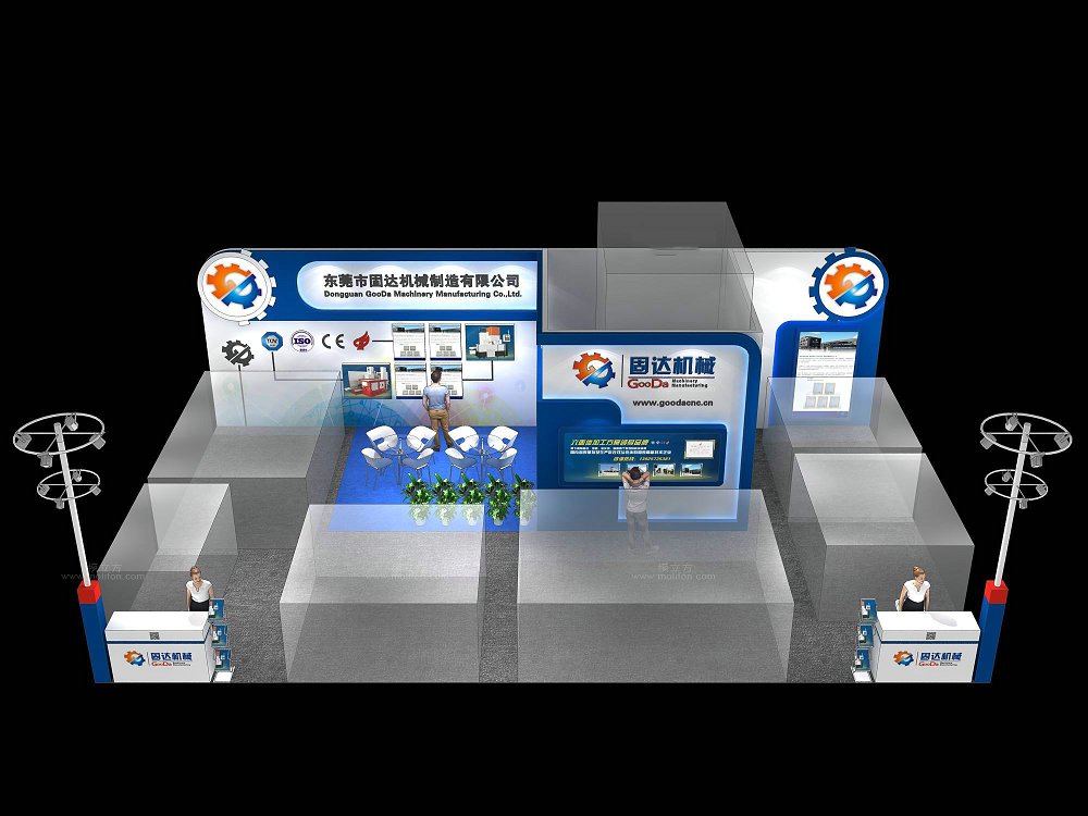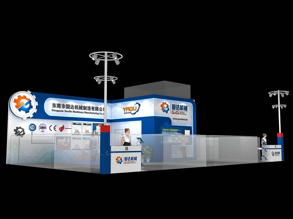 契合固達機械的品牌形象和產(chǎn)品特性,采用開放型結(jié)構(gòu),再搭配燈具燈光的效果,襯托出展位大氣、豪華的氛圍,突出一種簡約、時尚的品味。