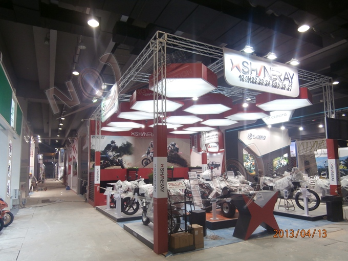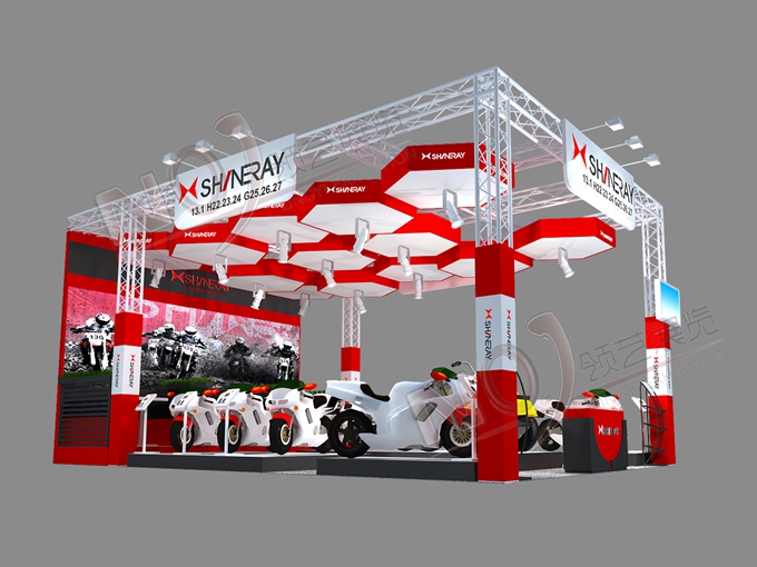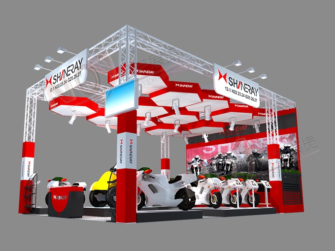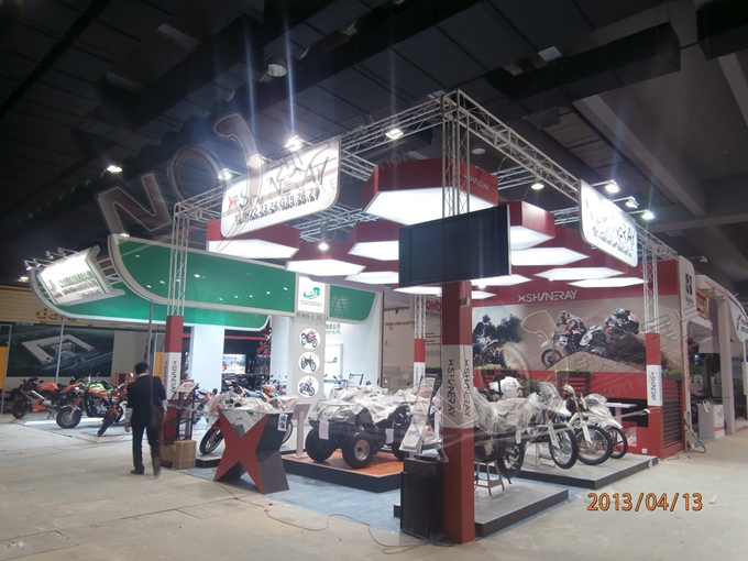 契合鑫源摩托的品牌形象和產(chǎn)品特性,采用矩形結(jié)構(gòu),再搭配燈具燈光的效果,襯托出展位簡約、時尚的氛圍,突出一種現(xiàn)代、簡約的時尚品味。