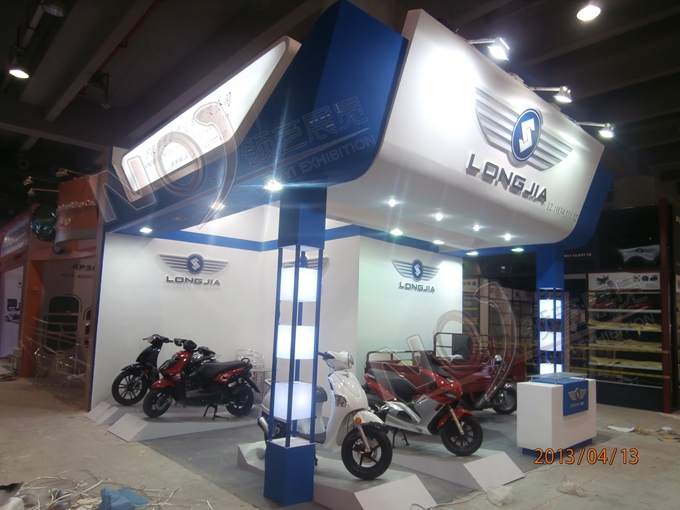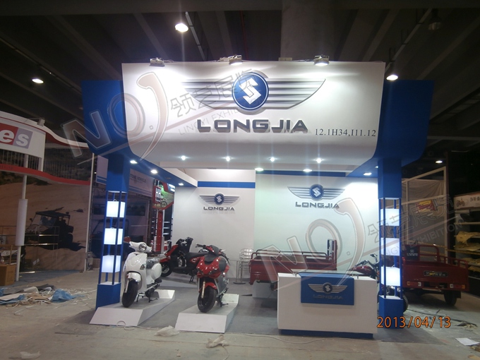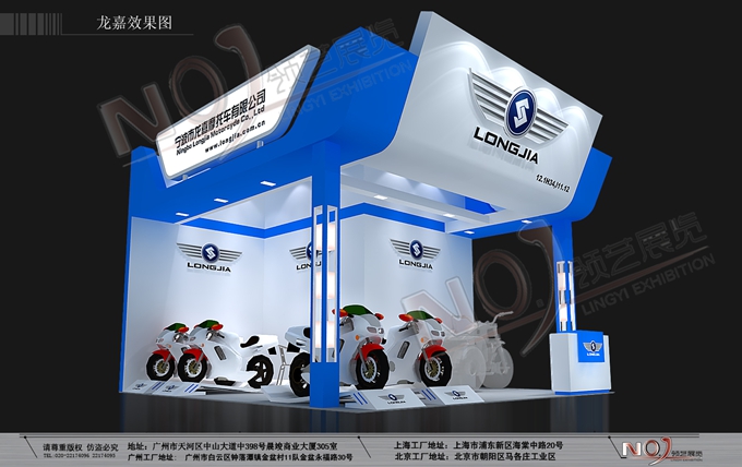 契合龍嘉摩托的品牌形象和產(chǎn)品特性,采用框型結(jié)構(gòu),再搭配燈具燈光的效果,襯托出展位超前、簡(jiǎn)約的氛圍,突出一種融合、個(gè)性的時(shí)尚品味。