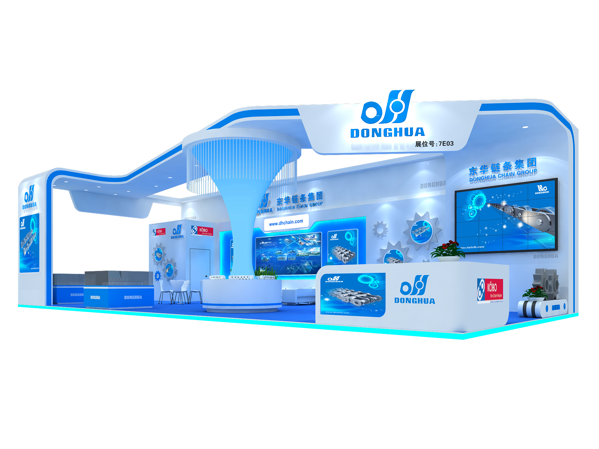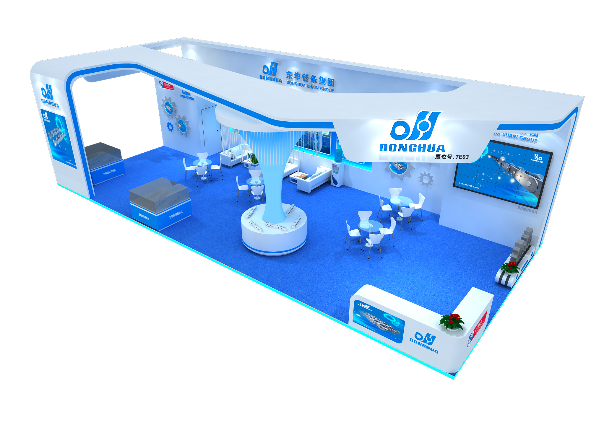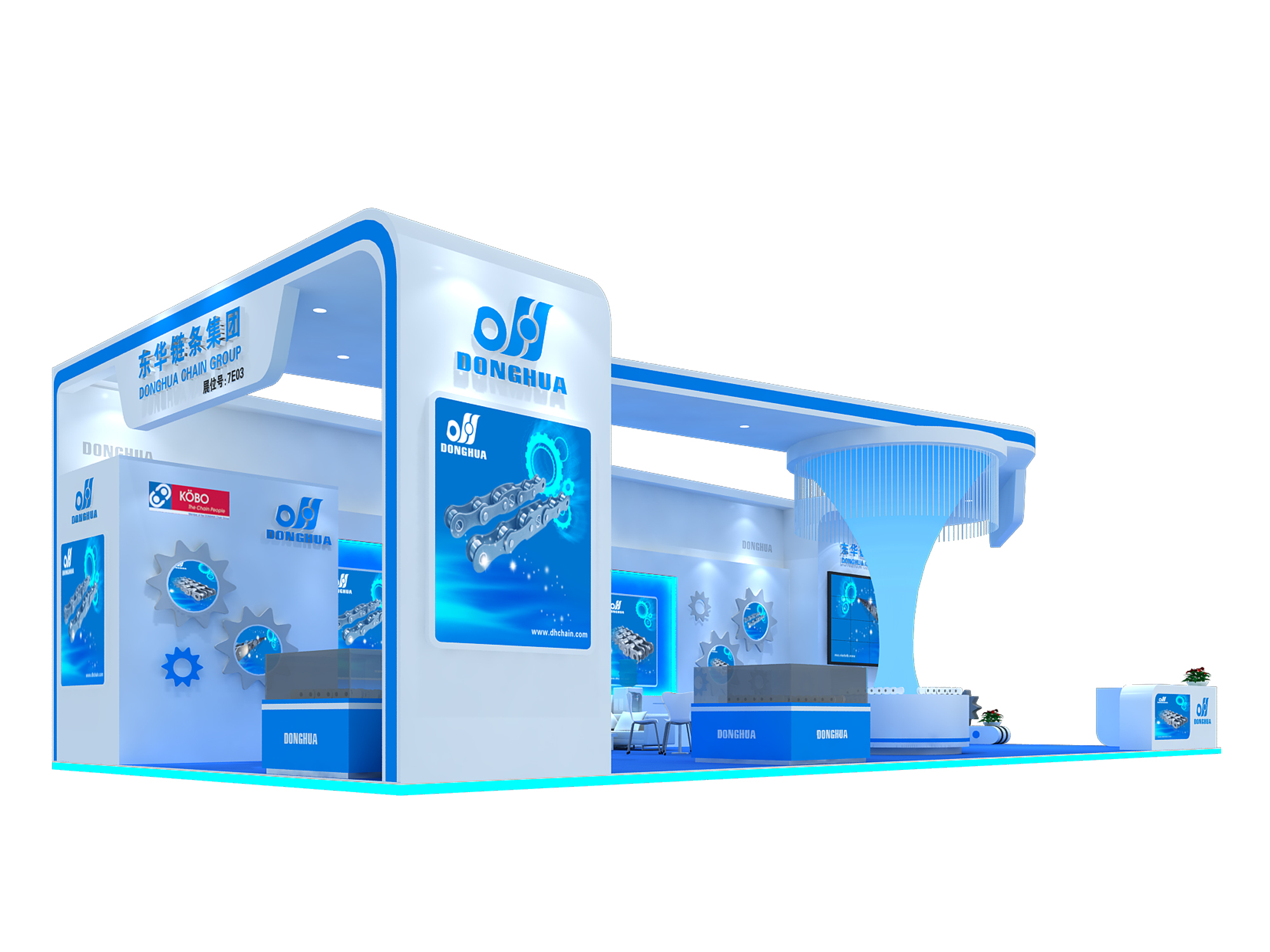 契合東華鏈條的品牌形象和產(chǎn)品特性,采用開放式式的造型,再搭配燈具燈光的效果,襯托出展位現(xiàn)代、清新氛圍,突出一種現(xiàn)代、高端的時(shí)尚品味。