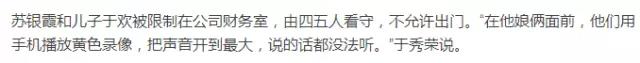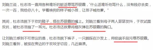吳學占讓手下拉屎,并將蘇銀霞按進馬桶里,要求還錢。案發(fā)當天,蘇銀霞和于歡母子被關在了一起?!笆裁丛掚y聽他罵什么,沒有錢你去賣,一次一百,我給你八十。學著喚狗的樣子喊小孩,讓孩子喊他爹?!倍胖竞泼撓掠跉g的鞋子,捂在蘇銀霞的嘴上。杜志浩脫下褲子,一只腳踩在沙發(fā)上,用極端手段污辱蘇銀霞。一個小時后,失控的于歡,抄起水果刀瘋狂捅向逼債者,結果四人中刀,其中杜志浩失血過多死亡。