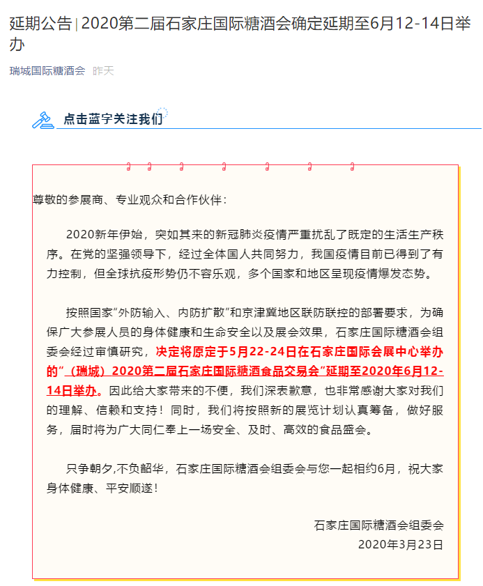 根據(jù)糖酒會(huì)設(shè)計(jì)搭建公司領(lǐng)藝展覽了解到,原定于5月22-24日在石家莊國際會(huì)展中心舉辦的“(瑞城)2020第二屆石家莊國際糖酒食品交易會(huì)”延期至2020年6月12-14日舉辦。如需糖酒會(huì)設(shè)計(jì)請(qǐng)聯(lián)系領(lǐng)藝展覽,希望我們能在糖酒會(huì)搭建上為您添磚加瓦,祝各位朋友收獲多多,滿載而歸!
