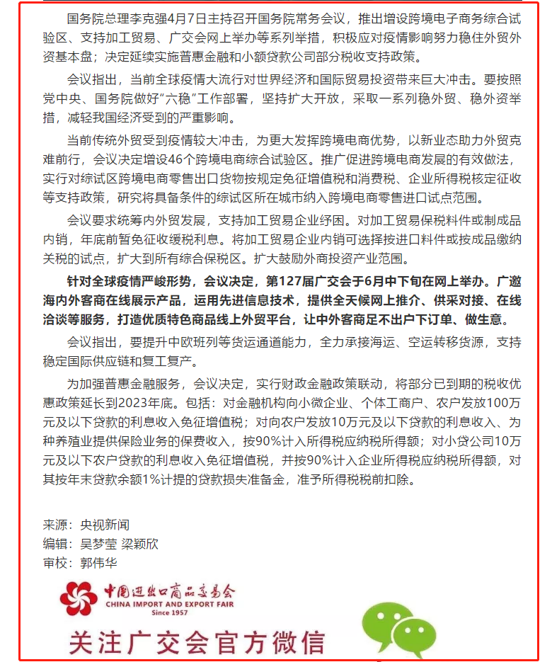 根據(jù)廣交會設(shè)計(jì)搭建公司領(lǐng)藝展覽了解到4月7日,央視新聞播發(fā)了《國務(wù)院:第127屆廣交會于6月中下旬在網(wǎng)上舉辦》。如需廣州展臺設(shè)計(jì)請聯(lián)系領(lǐng)藝展覽,希望我們能在展會搭建上為您添磚加瓦,祝各位朋友收獲多多,滿載而歸!