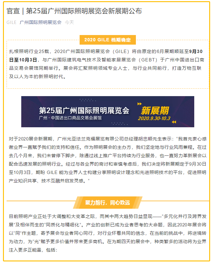 廣州照明展設(shè)計(jì)搭建公司領(lǐng)藝展覽了解到,扎根照明行業(yè)25載,2020廣州國(guó)際照明展覽會(huì)(GILE)將由原定的6月展期順延至9月30日至10月3日,與廣州國(guó)際建筑電氣技術(shù)及智能家居展覽會(huì)(GEBT)于廣州中國(guó)進(jìn)出口商品交易會(huì)展館同期舉行。展會(huì)將匯聚照明領(lǐng)域?qū)I(yè)人士,與行業(yè)共同前行,打造萬(wàn)物互聯(lián)及以人為本的新照明時(shí)代。如需照明展設(shè)計(jì)請(qǐng)聯(lián)系領(lǐng)藝展覽,希望我們能在照明展搭建上為您添磚加瓦,祝各位朋友收獲多多,滿(mǎn)載而歸!