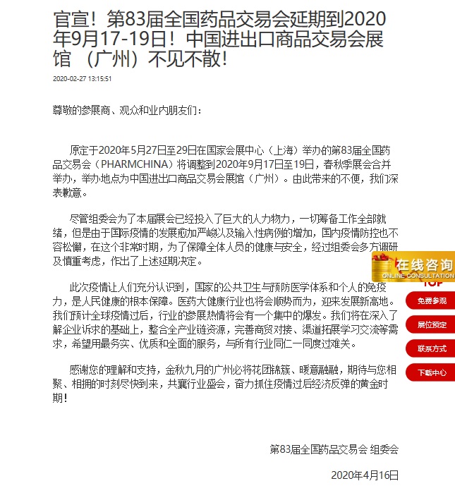 廣州藥交會設計搭建公司領藝展覽了解到,原定于2020年5月27日至29日在國家會展中心(上海)舉辦的第83屆全國藥品交易會(PHARMCHINA)將調(diào)整到2020年9月17日至19日,春秋季展會合并舉辦,舉辦地點為中國進出口商品交易會展館(廣州)。如需廣州藥交會設計請聯(lián)系領藝展覽,希望我們能在廣州藥交會搭建上為您添磚加瓦,祝各位朋友收獲多多,滿載而歸!
