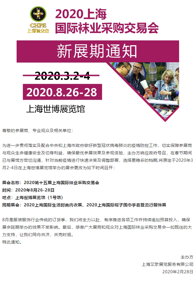 根據(jù)襪交會展臺設(shè)計公司領(lǐng)藝展覽了解到,為進一步貫徹落實及配合中央和上海市政府做好新型冠狀病毒肺炎的疫情防控工作,切實保障參展商與觀眾生命健康安全及切身利益,確保最優(yōu)參展效果及參觀體驗,主辦方響應(yīng)政府號召,在春節(jié)期間已與展館方密切溝通,針對當前疫情進行快速決策及調(diào)整部署,選擇更穩(wěn)妥的檔期,將原定于2020年3月2-4日在上海世博展覽館舉辦的展會更改為8月26-28日召開,如需襪交會展位設(shè)計裝修請聯(lián)系領(lǐng)藝展覽,希望我們能在襪交會布展搭建上為您添磚加瓦,祝各位朋友收獲多多,滿載而歸!