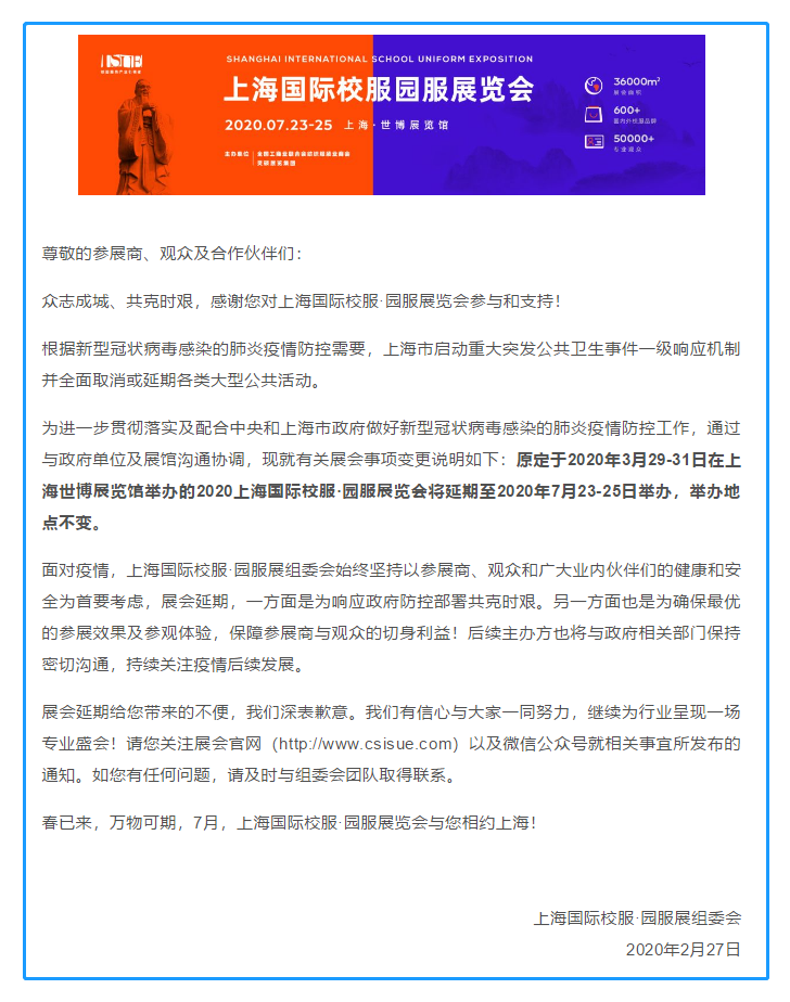 根據(jù)上海校服展設(shè)計(jì)搭建公司領(lǐng)藝展覽了解到,根據(jù)新型冠狀病毒感染的肺炎疫情防控需要,上海市啟動(dòng)重大突發(fā)公共衛(wèi)生事件一級(jí)響應(yīng)機(jī)制并全面取消或延期各類(lèi)大型公共活動(dòng)。為進(jìn)一步貫徹落實(shí)及配合中央和上海市政府做好新型冠狀病毒感染的肺炎疫情防控工作,通過(guò)與政府單位及展館溝通協(xié)調(diào),現(xiàn)就有關(guān)展會(huì)事項(xiàng)變更說(shuō)明如下:原定于2020年3月29-31日在上海世博展覽館舉辦的2020上海國(guó)際校服·園服展覽會(huì)將延期至2020年7月23-25日舉辦,舉辦地點(diǎn)不變。面對(duì)疫情,上海國(guó)際校服·園服展組委會(huì)始終堅(jiān)持以參展商、觀眾和廣大業(yè)內(nèi)伙伴們的健康和安全為首要考慮,展會(huì)延期,一方面是為響應(yīng)政府防控部署共克時(shí)艱。另一方面也是為確保最優(yōu)的參展效果及參觀體驗(yàn),保障參展商與觀眾的切身利益!后續(xù)主辦方也將與政府相關(guān)部門(mén)保持密切溝通,持續(xù)關(guān)注疫情后續(xù)發(fā)展。如需上海校服展設(shè)計(jì)請(qǐng)聯(lián)系領(lǐng)藝展覽,希望我們能在上海校服展搭建上為您添磚加瓦,祝各位朋友收獲多多,滿(mǎn)載而歸!