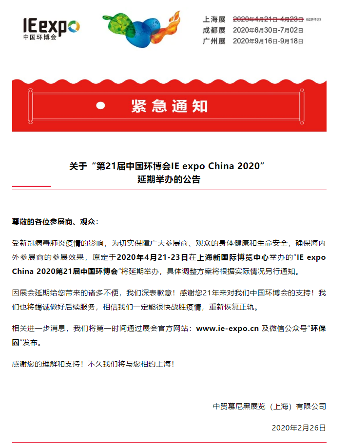 根據(jù)環(huán)博會設(shè)計(jì)搭建公司領(lǐng)藝展覽了解到,受新冠病毒肺炎疫情的影響,為切實(shí)保障廣大參展商、觀眾的身體健康和生命安全,確保海內(nèi)外參展商的參展效果,原定于2020年4月21-23日在上海新國際博覽中心舉辦的“IE expo China 2020第21屆中國環(huán)博會”將延期舉辦,具體調(diào)整方案將根據(jù)實(shí)際情況另行通知。相信我們一定能很快戰(zhàn)勝疫情,重新恢復(fù)正軌。相關(guān)進(jìn)一步消息,主辦將第一時間通過展會官方網(wǎng)站:www.ie-expo.cn 及微信公眾號“環(huán)保圈”發(fā)布。如需環(huán)博會設(shè)計(jì)請聯(lián)系領(lǐng)藝展覽,希望我們能在環(huán)博會搭建上為您添磚加瓦,祝各位朋友收獲多多,滿載而歸!