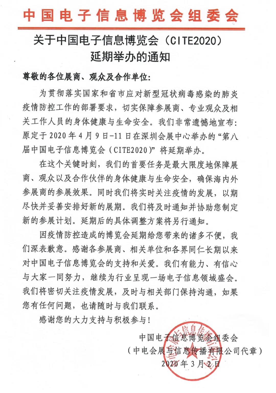 根據(jù)深圳電子展設(shè)計(jì)搭建公司領(lǐng)藝展覽了解到,原定于2020年4月9-11日在深圳會(huì)展中心舉辦的第八屆中國(guó)電子信息博覽會(huì)延期,延期后的具體調(diào)整方案將另行通知。如需深圳電子展設(shè)計(jì)請(qǐng)聯(lián)系領(lǐng)藝展覽,希望我們能在深圳電子展搭建上為您添磚加瓦,祝各位朋友收獲多多,滿載而歸!