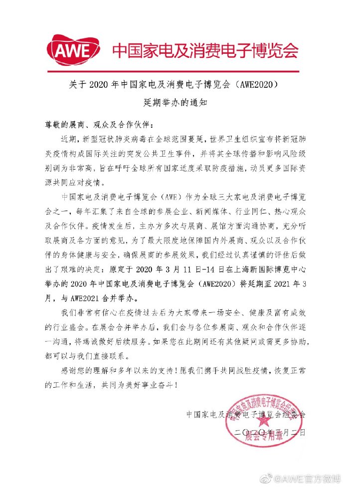根據(jù)上海電子展設(shè)計搭建公司領(lǐng)藝展覽了解到,AWE官方發(fā)布公告稱,原定于2020年3月11日-14日在在上海2020年中國家電及消費(fèi)電子博覽會(AWE2020)將延期至2021年3月,與AWE2021合并舉辦。這也意味著#AWE2020正式取消#。如需上海展臺設(shè)計請聯(lián)系領(lǐng)藝展覽,希望我們能在上海展臺搭建上為您添磚加瓦,祝各位朋友收獲多多,滿載而歸!