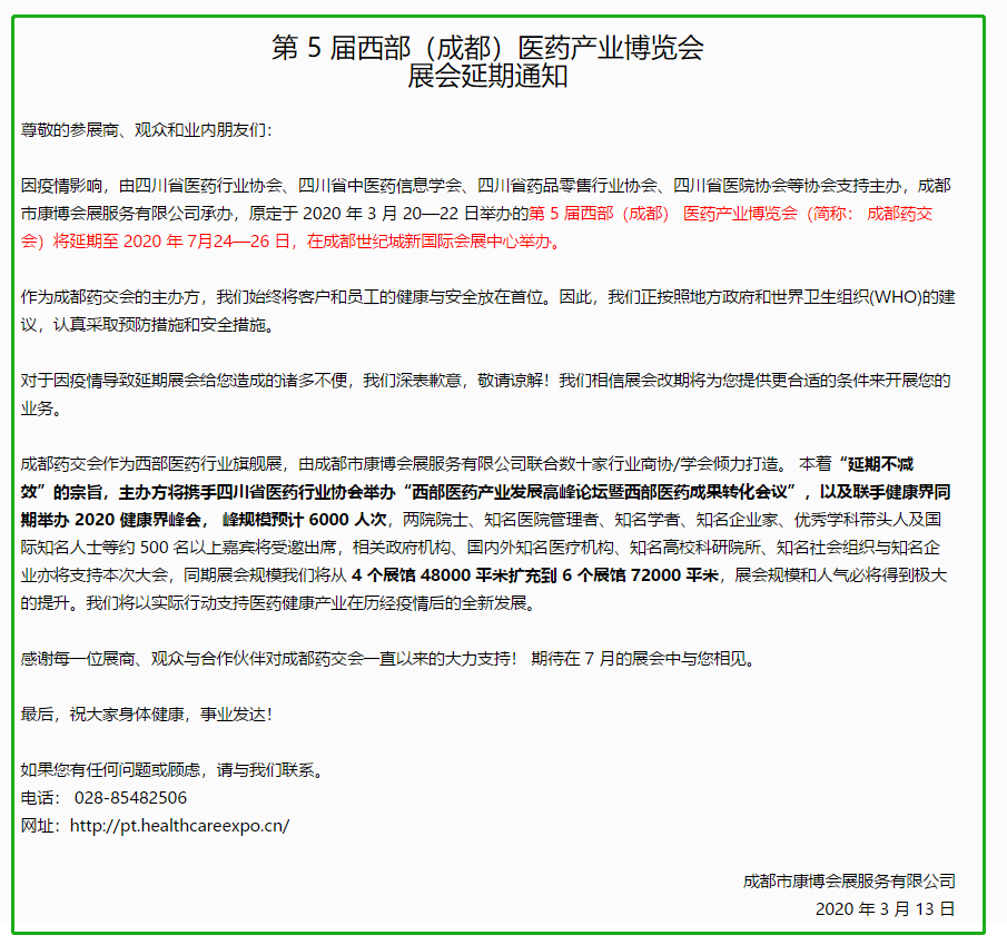 根據(jù)成都展臺搭建公司領(lǐng)藝展覽了解到,原定于 2020 年 3 月 20—22 日舉辦的第 5 屆西部(成都) 醫(yī)藥產(chǎn)業(yè)博覽會(簡稱: 成都藥交會)將延期至 2020 年 7月24—26 日,在成都世紀城新國際會展中心舉辦。如需成都展會設(shè)計請聯(lián)系領(lǐng)藝展覽,希望我們能在成都展會搭建上為您添磚加瓦,祝各位朋友收獲多多,滿載而歸!